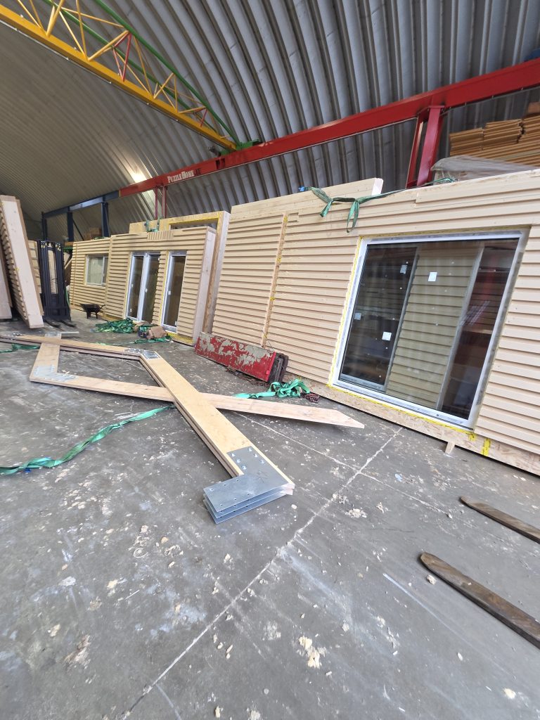 2026-ban tovább bővítjük a gyártási és logisztikai lehetőségeinket: igény esetén a falakat vagy modulokat már nyílászárókkal és vakolattal együtt is tudjuk szállítani. A helyszíni szerelés során a falakat jellemzően egy nap alatt összeállítjuk, és még aznap, de legkésőbb a következő napon a tetőszerkezetet is felszereljük. Ennek köszönhetően az épület rövid idő alatt időjárásálló állapotba kerülhet, ami csökkenti a kivitelezési kockázatokat és segíti a további szakipari munkák ütemezését.